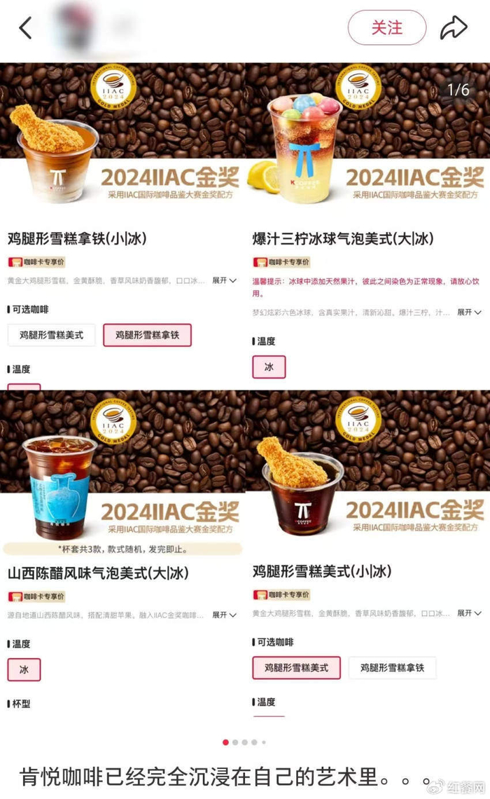 肯悦咖啡也在今年创意咖啡的风潮下持续发力,甚至被网友调侃“已经完全沉浸在自己的艺术里”。据了解,今年以来,肯悦咖啡已陆续上线过山西陈醋风味气泡美式、吮指原味鸡风味拿铁、五仁蛋挞拿铁、万事大吉汤圆加朵浪漫等多款创意咖啡。其中山西陈醋风味气泡美式凭借大胆搭配,仅在小红书平台就有超29万篇相关帖子,讨论热度居高不下。