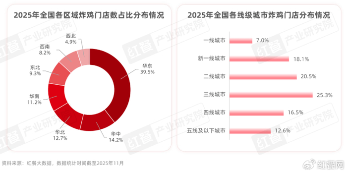 红餐大数据显示,从炸鸡门店的区域分布来看,华东地区占据了全国门店数将近四成的比例,而东北、西南和西北地区的门店数占比均不足10%;从线级城市分布来看,三线城市的炸鸡门店数最多,占比为25.3%,尽管三线及以下城市的炸鸡门店总占比54.4%,但相较于一线、新一线城市,下沉市场的炸鸡门店密度仍然较低。