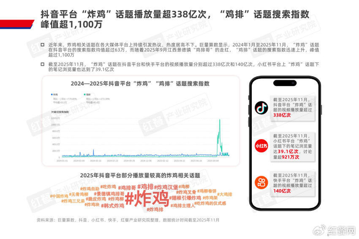 此外,在抖音、快手两大平台,“炸鸡”话题的视频播放量分别累计超过338亿次和140亿次;小红书平台上,“炸鸡”话题下的笔记浏览量更是高达39.1亿次,足见炸鸡这一美食在消费者心中的分量。