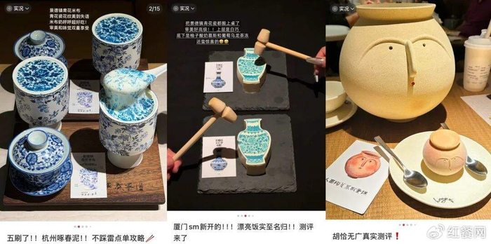 例如胡恰推出的“人面陶瓷慕斯”,造型逼真,充满萌趣,“青花瓷慕斯”则随餐附配小木锤,引导食客亲手敲碎糖质“瓷壳”,赋予了用餐的仪式感与参与感。另一品牌啄春泥的特色菜品——景德镇青花米布,则将景德镇青花印纹直接“复刻”在米布顶端,搭配温润的青花瓷器皿,让不少消费者感叹“宛如艺术品”。