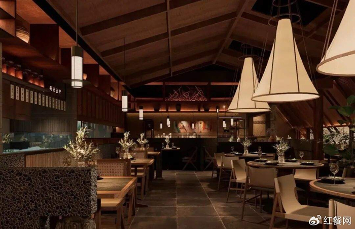 比如胡恰·景德江西菜将景德镇的“瓷窑”元素植入明厨亮档,利用质朴青砖搭配手工陶瓷,让客人仿佛置身赣北的青砖黛瓦中;云贵菜品牌贵Guui则将苗族银饰、蜡染布料等民族元素搬进门店,让餐厅成为一张地域文化名片;而主打宁波海鲜的甬江烟火,则提取渔船、礁石、滩涂等海岸标识,以原木、粗石、竹编与植物交织布局,还原了闲适优雅的海边气息。