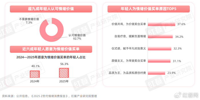 《2025 Z世代情绪消费报告》显示,超过九成年轻人认可情绪价值,且愿意为情绪价值买单的年轻人占比从2024年的40.1%提升至2025年的56.3%。