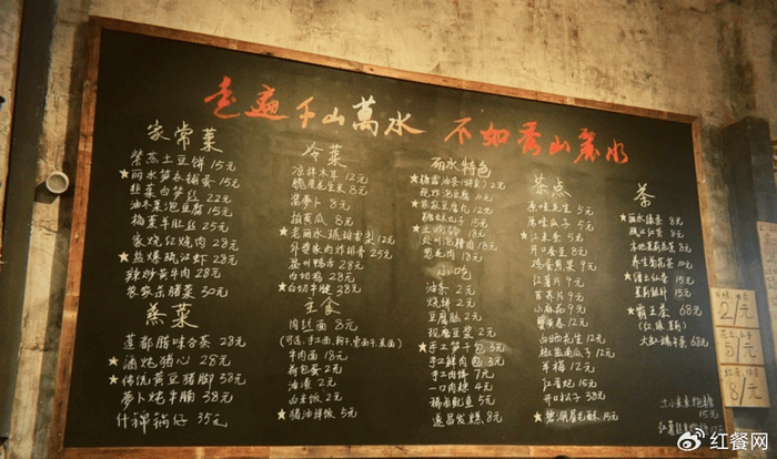 走进店内,3000平的超大空间里,怀旧氛围更加明显。四周均为斑驳的墙面,有的地方还裸露出红砖,随处可见“广阔天地,大有作为”“团结、紧张、严肃、活泼”等上世纪流行的宣传语。连菜单用黑板粉笔书写,用餐区则配以木桌矮凳,整体给人以穿越回80年代的体验感。
