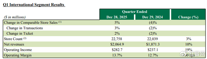 2026财年第一季度(2025年10-12月),营业收入增长5%至99亿美元,同店销售额同比增长4%。全球新增了128家咖啡馆,营业利润率为10.1%。