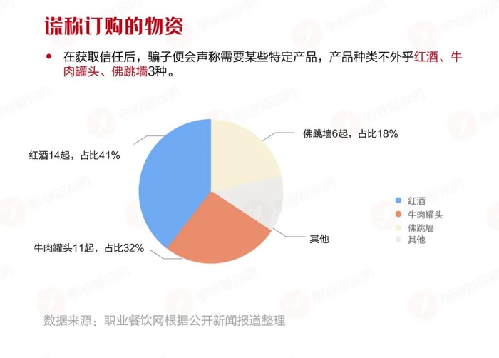 从以往的诈骗案件来看,骗子们谎称要购买的产品最多的便是“红酒”、“佛跳墙”、“牛肉罐头”这三种,都是客单价高且一般餐厅没有的产品。