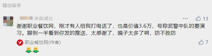 “谢谢职业餐饮网,刚才有人给我打电话了,也是价值3.6万,号称武警中队的要演习,聊到一半看到你发的推送,太感谢了,骗子太多了啊,防不胜防”。