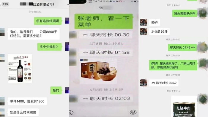 5月底,江苏常州一家酒店的工作人员唐女士接到一个电话,对方自称是某企业的“黄总”,说有30个人吃饭需要订包厢。互加微信后,对方又提出需要订购10箱指定品牌的红酒,请唐女士代为采购,并给了一个供应商微信。随后,唐女士加一个微信名“干红代理张杰”的人,这名“张总”不断催促唐女士转钱,至少先付两千元订金。