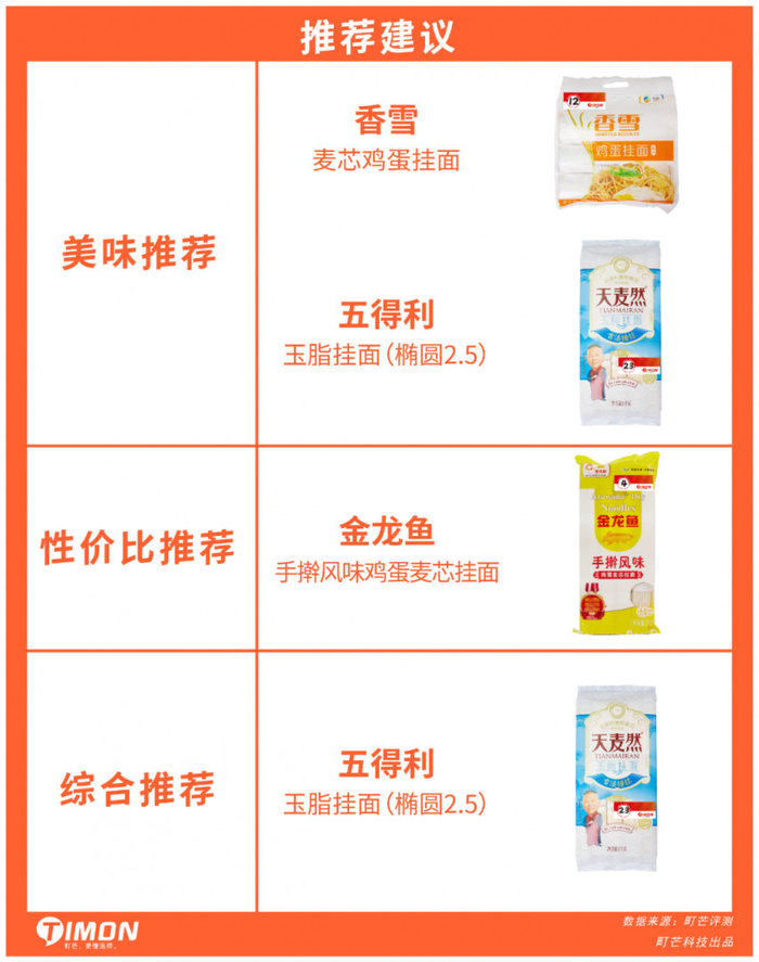 ● 最好吃:香雪麦芯鸡蛋面、五得利玉脂挂面(椭圆2.5);