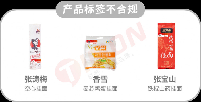 标签不合规的三款产品是张涛梅空心挂面、香雪麦芯鸡蛋挂面、张宝山铁棍山药挂面,不合规原因都是实测钠含量要≥120%标示值。