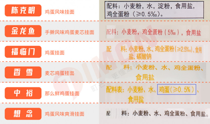 陈克明、金龙鱼、福临门、香雪、想念用的全都是鸡全蛋粉,只有中裕用了鲜鸡蛋。