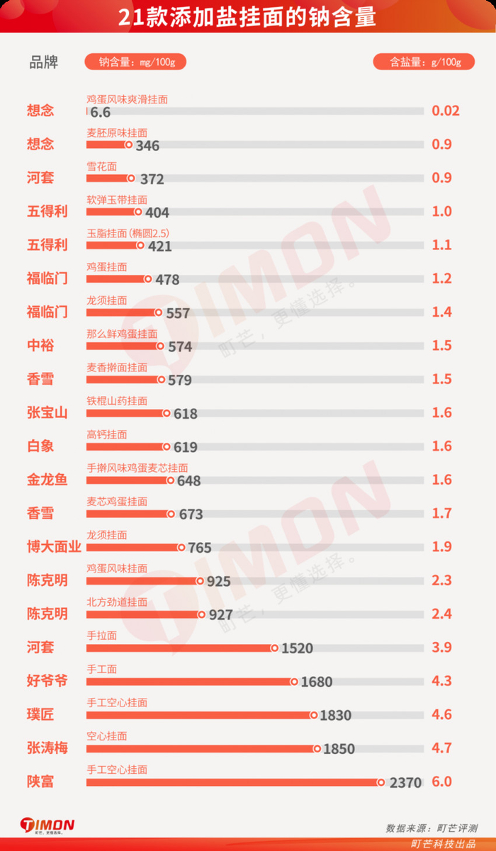 24款产品中只有塞北雪、裕湘的挂面没添加盐,其余21款加了盐的挂面中钠含量差异巨大。