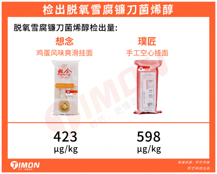 《食品中真菌毒素限量》GB 2761截图我们将24款挂面送去专业实验室检测,其中22款未检出。只有璞匠的手工空心挂面、想念的鸡蛋风味爽滑挂面检出脱氧雪腐镰刀菌烯醇,但都在限量范围内,安全性上不用担心,但品质上大打折扣,这两款产品我们也在安全性上做了扣分处理。