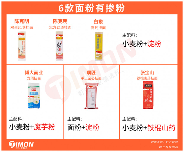张宝山是因为主打的就是山药挂面,其它5个品牌无论是加淀粉还是魔芋粉,目的都是为了让面条吃起来更筋道爽滑。