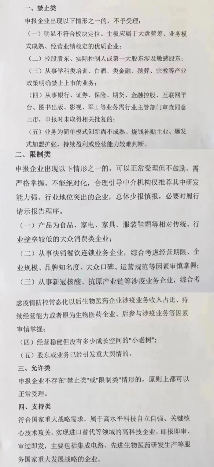 然而,没高兴多久,一则IPO红绿灯行业审核标准细则的消息传出,细则显示,学科类培训、白酒、类金融、殡葬、宗教等禁止上市;食品、家电、快消餐饮、家具、服装鞋帽、涉疫企业等上市受限;集成电路、先进生物医药研发生产等企业获支持,“即报即审、审过即发”。