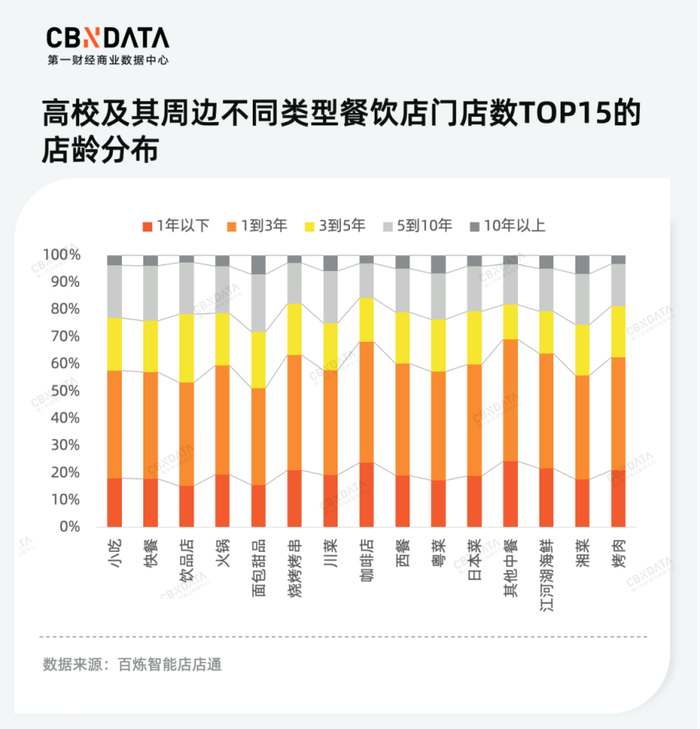 在店铺的经营年限方面,高校区域的商业生态也展现出了与行业整体相符的快速更新换代特征。主要品类的餐饮店中,近20%的门店是在近一年内新开业。对于多数品类而言,三年以下的店铺数量占比约为六成,而经营时间超过十年的“老店”所占比例则不足一成。