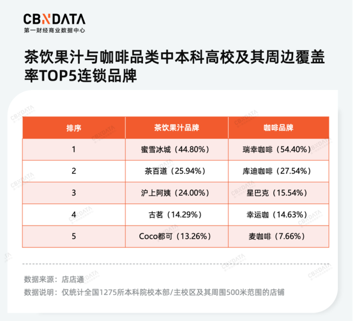 此外,在高校覆盖率方面,CBNData发现,头部知名连锁品牌对高校周边的覆盖存在显著差异。以茶饮果汁与咖啡品牌为例,蜜雪冰城与瑞幸咖啡在高校市场的覆盖能力上明显领先于同类型其他品牌,其市场覆盖率分别较第二名高出18.86%和26.86%。沪上阿姨与库迪咖啡又分别比古茗和星巴克高出9.71%和12%。
