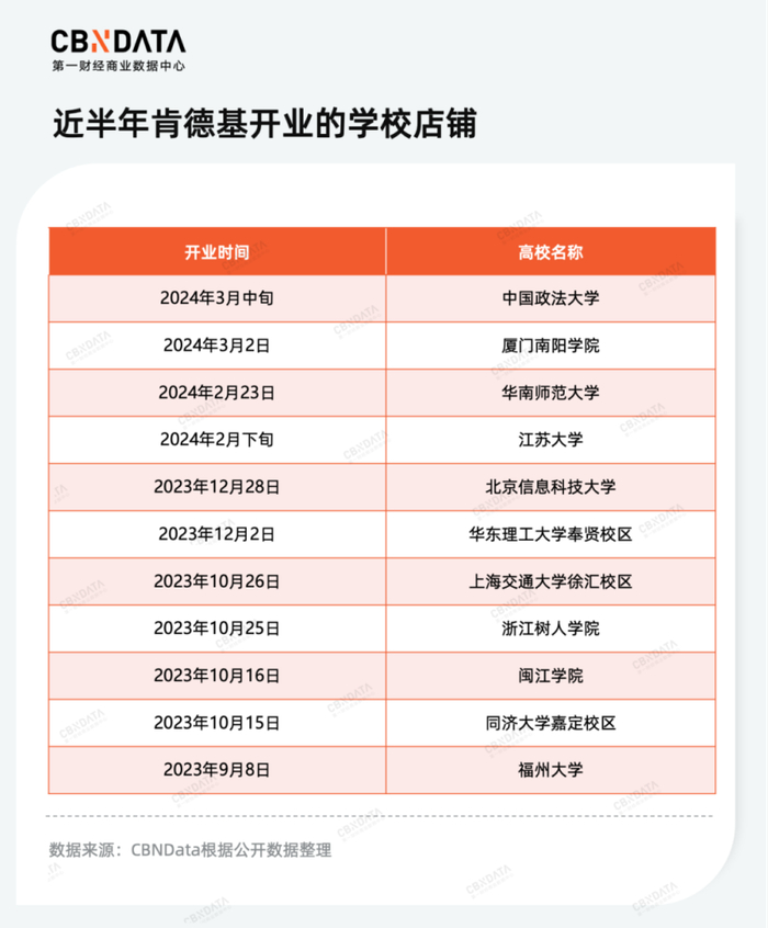 图片来源:幸运咖官网截图当咖啡品牌将高校视为重要拓展一环时,高校早已是连锁快餐品牌的“隐形战场”。实际上,麦当劳早在2013年便在华中科技大学开设了其首家校园店。经过十年的发展,麦当劳已在全国高校中设立了逾60家门店。肯德基亦不甘落后,在2019年推出了全国首家教学餐厅后,北京和四川的首家校园店也相继开业。根据CBNData的不完全统计,近半年来,肯德基已经成功进驻了11所高校。