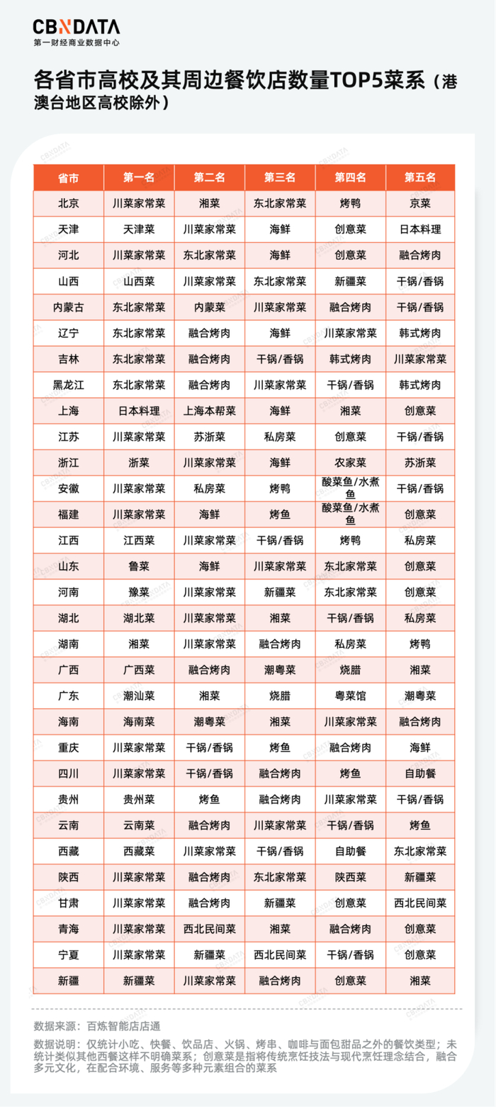 值得注意的是,除了各地皆宜的品类,地域特色在高校周边餐饮中同样显著,不同地区的学生也对本地特色菜“情有独钟”。从北到南,从东到西,超过八成的省市高校周边餐饮店铺中,本地特色菜系占据了店铺数量的前五位,学校店与本地饮食文化一脉相承。