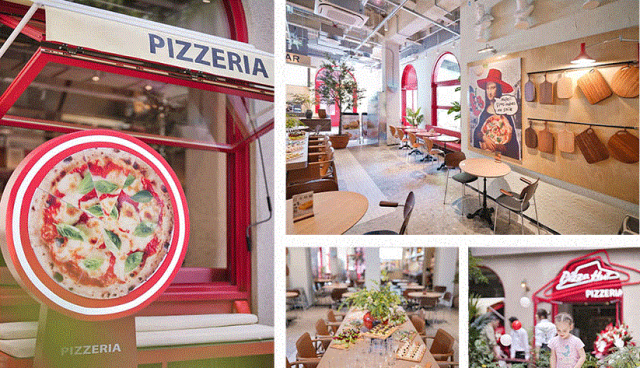 从门店空间来看,Pizzeria以白色和红色为主色调,当中点缀了绿色植物元素,以细节设计打破空间束缚,让消费者能够全方位体验意式慢生活。