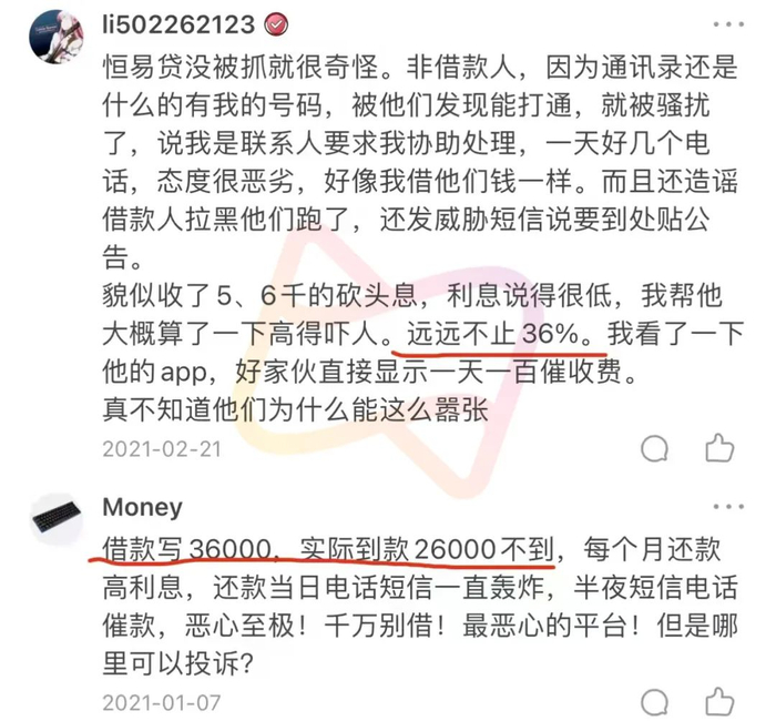 恒易贷预先从借款中扣取服务费,并通过在合同金额中叠加服务费的方式来降低实际年利率的方式显然不合法规,并且以实际到账的金额作为计算,恒易贷的多项借款均超过36%的利率红线。