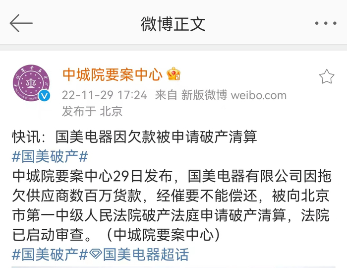 国美的债务危机进一步发酵,11月29日,中城院要案中心官方微博发布公告称,国美电器有限公司因拖欠供应商数百万货款,经催要不能偿还,被向北京市第一中级人民法院破产法庭申请破产清算,法院已启动审查。