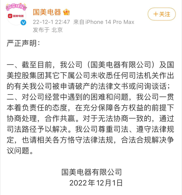 12月1日晚间,国美电器官方账号发布声明称,国美电器及国美控股集团其它下属公司未收悉任何司法机关作出的有关国美电器被申请破产的法律文书或问询谈话。