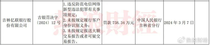近日,央行吉林省分行开出罚单,吉林亿联银行因三项违法违规被重罚758.34万元。