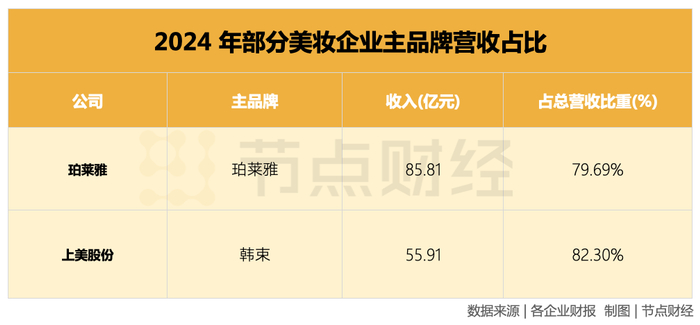 同期,珀莱雅、贝泰妮、上美股份护肤类收入占比分别为83.68%、83.71%、87.2%,若加上彩妆,前二者来自美妆的贡献比高达90%+。