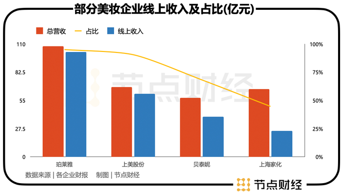 数据显示,2024年,珀莱雅、上美股份、贝泰妮线上渠道的收入分别为102.34亿元、61.5亿元、39.12亿元,占营收的比重为95.06%、90.5%、68.2%。
