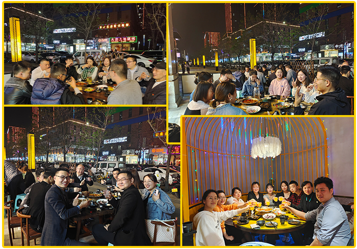 最后,为了庆祝厚银成立七周年,厚银领导层组织全体员工前往公司旗下餐饮品牌——嘎嘎鸭脑壳郑州店共进生日晚宴。晚宴现场气氛热烈,嘎嘎鸭脑壳准备了店里所有的特色招牌菜,大家倍受鼓舞,深感自豪,欢声笑语,好不热闹!