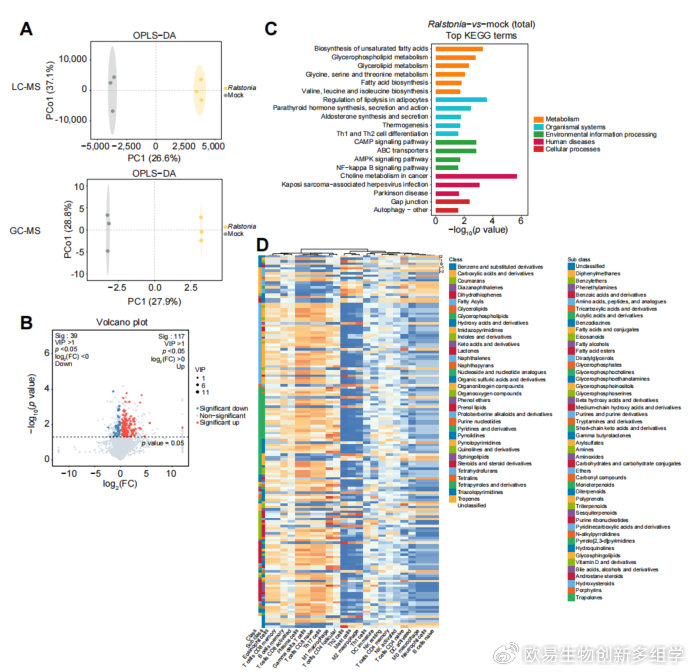 (HCC 中代谢变化与免疫浸润的关联分析。(A) 代谢物的 OPLS -DA分析数据(上图: UPLC -MS;下图:GC-MS),VIP值>1的代谢物视为显著。(B) 火山图分析显示模拟组与Ralstonia sp.组间差异表达代谢物(p1)。(C) KEGG 富集分析基于超几何检验(p