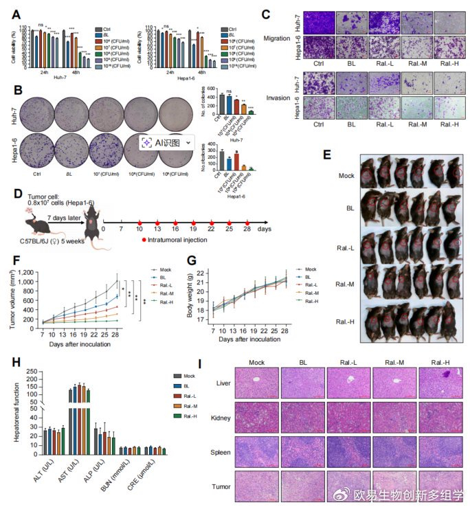 (体外和体内实验均证实Ralstonia sp.对 HCC 细胞具有抑制作用。(A) CCK -8实验显示Huh-7和Hepa1-6细胞与Ralstonia sp.共培养48小时后的存活率(每组5孔)。(B) HCC 细胞共培养48小时后的克隆形成实验(每组3孔)。(C)评估 HCC 细胞与Ralstonia sp.共培养48小时后迁移和侵袭能力的Transwell实验(每组3孔)。(D)小鼠实验示意图(由Figdraw生成)。瘤内注射每3天进行一次,具体剂量为:PBS(对照)、长双歧杆菌(1×10⁸ CFU),以及低(1×10⁷ CFU)、中(1×10⁸ CFU)、高(1×10⁹ CFU)剂量的Ralstonia sp.。(E)皮下移植瘤的代表性图像(每组6只)。(F)动物实验过程中肿瘤体积变化。(G)治疗期间小鼠体重变化(每组6只)。(H)血清ALT、AST、ALP(肝功能)及BUN、CRE(肾功能)水平(每组6只)。(I)小鼠肝、肾、脾及肿瘤组织的H&E染色(每组3只)。数据以均值±标准误表示。统计比较采用非配对双尾Stud法。)