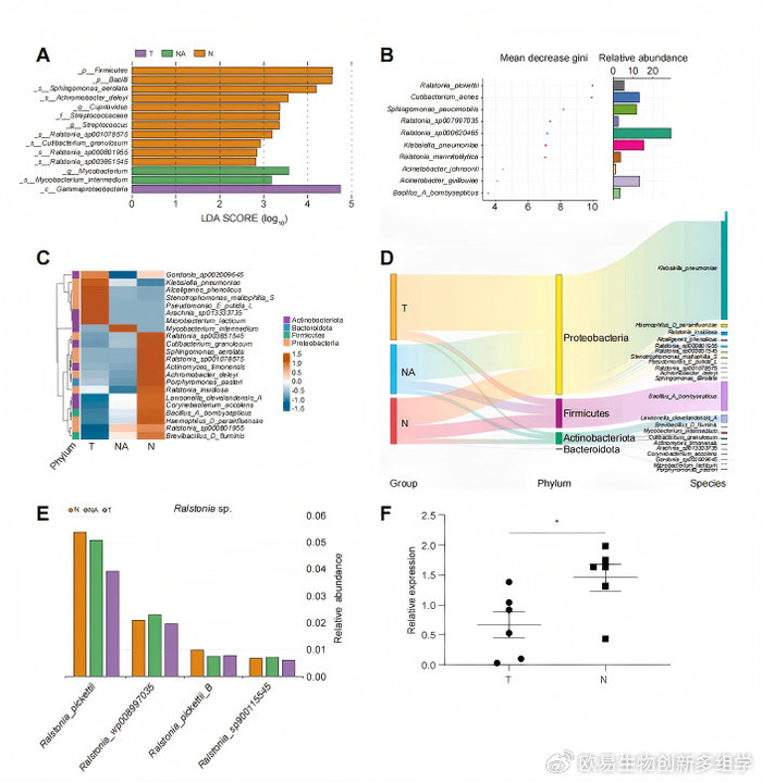(肿瘤内微生物群落组成及病理组间丰度差异。(A)条形图展示通过LEfSe分析(结合Kruskal-Wallis和Wilcoxon秩和检验与线性判别分析)识别的优势菌种 LDA 评分。紫色、绿色和橙色条形分别表示在T组(肿瘤)、NA组(邻近正常组织)和N组(正常组织)中相对丰度较高的菌种。(B)随机森林分析评估了三组间相对丰度存在显著差异的前10种菌种。(C)热图呈现了区分三组的关键细菌菌种平均丰度分布。(D)桑基图展示了正常对照组(N组)向 HCC 病例(T组和NA组)转移的细菌分类群流动路径及相对比例。(E)Ralstonia属菌种相对丰度特征。(F)通过qPCR分析从T组和N组随机选取的组织样本(每组n=6)验证了Ralstonia属菌种的丰度。统计学差异通过独立样本t检验进行评估。)