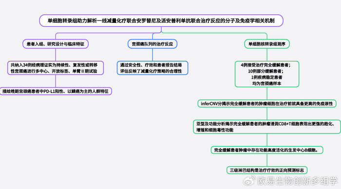2025年11月26日,四川大学华西第二医院周圣涛、福建省肿瘤医院孙阳、徐沁、胡丹和中山大学孙逸仙纪念医院卢淮武研究团队合作,在肿瘤学国际期刊Cancer Discovery杂志发表最新研究成果:Molecular and immune correlates of response to first-line de-escalated chemotherapy plus penpulimab and anlotinib in advanced cervical cancer。研究针对PD-L1阳性复发或转移性宫颈癌患者,提出并验证了一种创新的治疗策略——减量化疗联合免疫检查点抑制剂(penpulim 基础与免疫机制。研究为转移性、持续性或复发性宫颈癌患者一线治疗新策略的可行性奠定了基础。欧易生物提供了该项目的单细胞核转录组测序实验和分析工作。