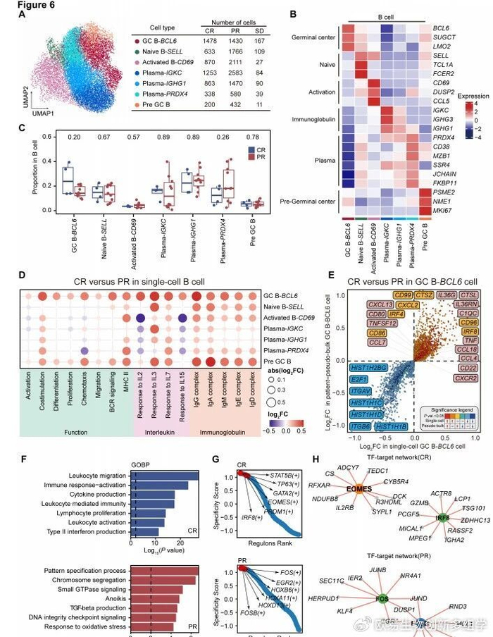 基于单细胞数据对B细胞进行亚型分析,标注出了7个亚类, 比较CR和PR患者之间7个B细胞亚群相对比例的差异,结果显示,各亚群的丰度在两组间无统计学显著差异结果(图6A-C))。进一步对转录信息分析发现完全缓解患者的生发中心B细胞表现出更强的激活状态,其高表达B细胞激活、趋化和TNF信号相关基因,且通路富集分析显示白细胞迁移、免疫应答激活、细胞因子产生等通路活性显著上调(图6D-F)。单细胞转录因子分析发现,完全缓解患者的生发中心B细胞具有独特的转录因子调控网络(如STAT5B, GATA2, EOMES),可能调控IL2RB、IGHA1等关键靶基因,增强其抗肿瘤功能(图6H)。