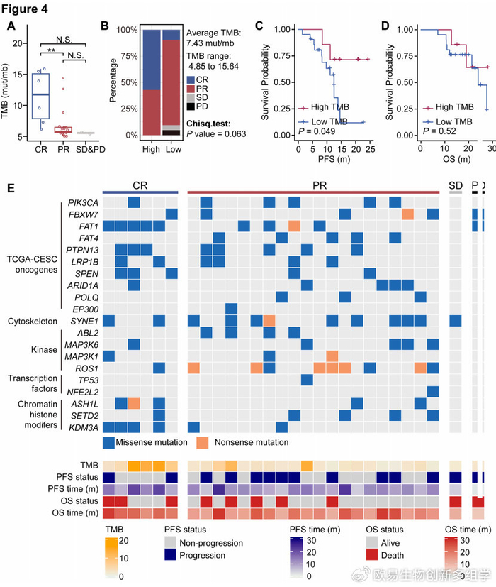 通过对15例患者治疗前肿瘤样本进行单细胞核转录组测序,分析了肿瘤细胞的转录特征。通过inferCNV分析发现,完全缓解患者CR的肿瘤细胞在单细胞水平具有最低的拷贝数变异评分(图3C-E)。转录因子活性分析显示,完全缓解患者的肿瘤细胞中,与免疫激活相关的转录因子(如EOMES、GATA2/3、IRF4/8)活性最高(图3F,G)。此外,完全缓解患者的肿瘤细胞高表达免疫激活相关基因(如LTF、IGHA1、IGHG1等),且富集于上皮细胞增殖、免疫应答激活和II型干扰素产生等通路(图3H-J)。进一步从基因组层面分析,发现CR患者的肿瘤突变负荷也显著高于部分缓解患者PR,且高肿瘤突变负荷TMB与更高的客观缓解率ORR和更长的无进展生存期PFS相关(图4)。