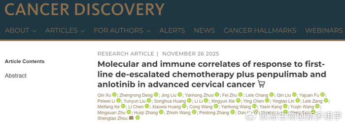 Xu Q, Deng Z, Liu J, Zhuo Y, Zhu F, Chang L, Liu Q, Fu Y, Li P, Liu Y, Huang S, Li L, Xie X, Chen Y, Lin Y, Zang L, Ke M, Chen L, Huang X, Wang C, Wang Y, Kang Y, Wang Y, Zhu M, Zhang H, Wang Z, Zhang P, Hu D, Lu H, Sun Y, Zhou S. Molecular and immune correlates of response to first-line de-escalated chemotherapy plus penpulimab and anlotinib in advanced cervical cancer. Cancer Discov. 2025 Nov 26. doi: 10.1158/2159-8290.CD-25-1315. Epub ahead of print. PMID: 41297028.