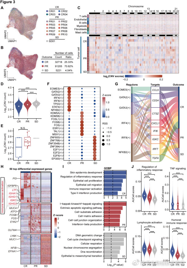 2. 单细胞转录组测序揭示完全缓解(CR)患者的肿瘤细胞在治疗前就具备更高的免疫原性:表现为更高的肿瘤突变负荷(TMB)和更活跃的免疫相关基因表达(如免疫球蛋白基因)。