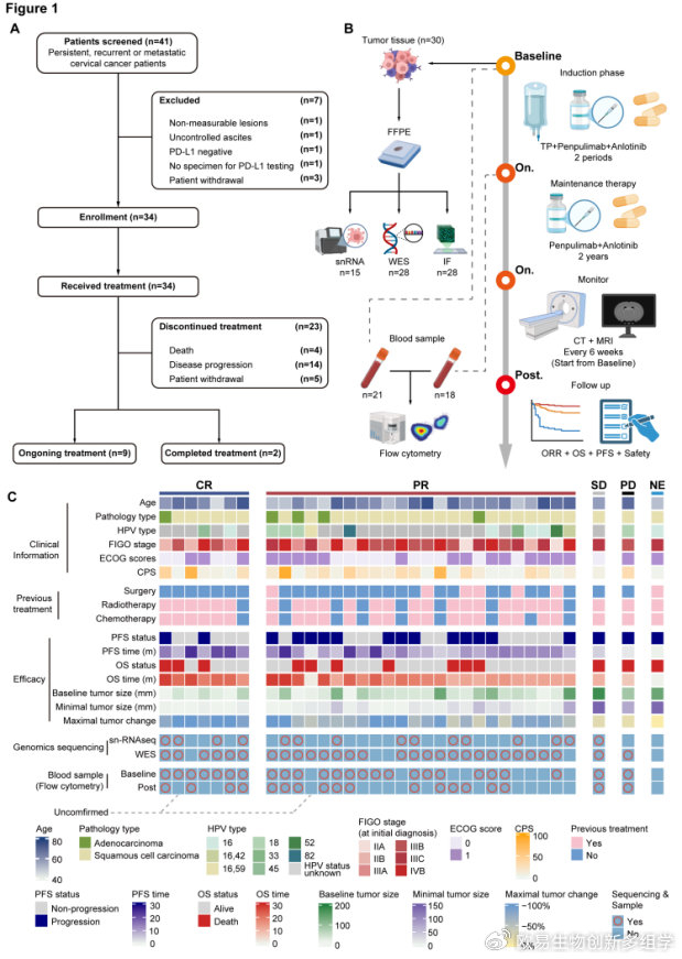 在此背景下,“减量化疗”联合新型靶向药物的理念应运而生。然而,安罗替尼及派安普利单抗联合治疗在宫颈癌中的应用,尤其是与短期化疗联用的策略,其疗效与安全性尚未被系统评估。同时,能预测其疗效的生物标志物以及免疫细胞的功能状态仍属未知。因此,本研究旨在通过一项前瞻性II期临床试验,评估短程化疗联合安罗替尼及派安普利单抗随后双靶向维持治疗的可行性,并利用单细胞测序等技术,深度解析肿瘤免疫微环境特征,以揭示疗效差异的内在机制并挖掘精准生物标志物。