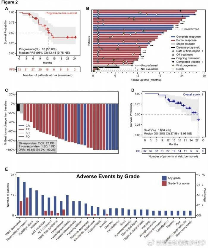 在32例可评估疗效的患者中,研究者评估的客观缓解率(ORR)高达93.8%,完全缓解和部分缓解分别为6例和24例,疾病控制率(DCR)为96.9%。这一极高的缓解率是本研究的主要亮点,并满足了预设的研究终点。该联合方案的安全性特征是可控的,与其各个组分的已知毒性谱相符。同时本研究前瞻性地使用国际通用的EORTC QLQ-C30和EQ-5D量表,系统评估了患者在治疗过程中的生活质量变化。结果显示,接受“两周期化疗诱导+双靶向维持”这一方案的患者,其自我报告的生活质量在多个关键领域表现出改善趋势(图2)。