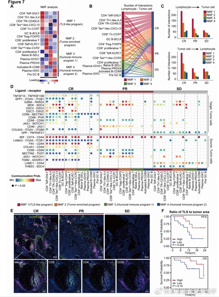 研究通过非负矩阵因子分析鉴定了四个淋巴细胞程序,其中“TLS样程序”,该程序富集了滤泡辅助T细胞、生发中心B细胞和初始T细胞——这正是构成功能性TLS的核心细胞组件(图7A)。完全缓解患者的淋巴细胞(尤其是“TLS样程序”中的细胞)与肿瘤细胞之间的相互作用数量最多(图7B,C)。配体-受体对分析显示,在完全缓解患者中,TLS样程序主要通过TNFSF10-TNFRSF10B、SPP1-整合素、FN1-CD44等信号与肿瘤细胞进行通讯(图7D)。多重免疫荧光染色清晰显示,完全缓解患者的肿瘤组织中存在结构完整、边界清晰的TLS,而在疗效较差的患者中则稀少。定量分析证实,CR患者的TLS密度和TLS/肿瘤面积比显著更高。(图7E)。拥有高TLS/肿瘤面积比的患者,其无进展生存期显著优于低比值患者(图7F)。空间分析进一步揭示,在CR患者中,活跃的FN1-CD44互作信号就紧密围绕着TLS发生,形象地展示了TLS作为“局部免疫指挥中心”的功能。