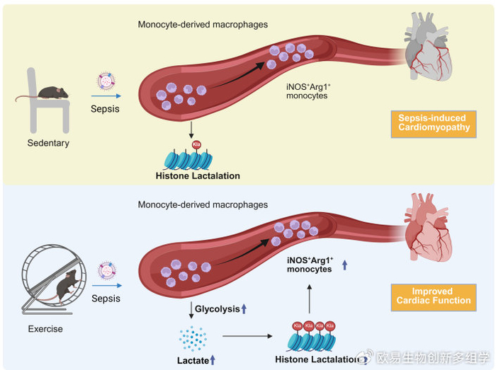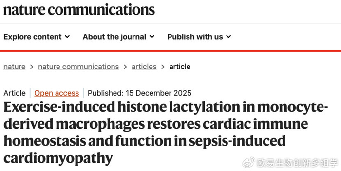 2025年12月15日,浙江大学医学院尚敏、傅国胜、钱俊斌、马博轩团队在国际权威期刊Nature Communications在线发表题为“Exercise-induced histone lactylation in monocyte-derived macrophages restores cardiac immune homeostasis and function in sepsis-induced cardiomyopathy”的研究论文。该研究首次揭示运动通过重编程单核细胞代谢、促进组蛋白乳酸化,调控巨噬细胞功能转换,进而修复脓毒症所致心肌损伤的全新机制,为脓毒症心肌损伤及相关心血管疾病的治疗提供了创新性策略。主要通过表观遗传组学(聚焦组蛋白乳酸化修饰)分析,结合单细胞转录组测序和相关细胞功能验证与动物模型实验,发现运动可诱导单核细胞源巨噬细胞发生组蛋白乳酸化修饰,该修饰能调控巨噬细胞表型重塑(抑制M1促炎型巨噬细胞、增加抗炎修复型巨噬细胞),进而重构脓毒症心肌病模型中的心脏免疫微环境稳态,减轻心肌病理损伤,最终改善心脏收缩与舒张功能,阐明了运动通过巨噬细胞表观遗传调控干预脓毒症心肌病的核心机制。