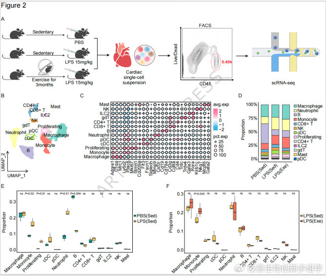 对SICM小鼠心脏CD45免疫细胞测序,鉴定出13类细胞群(巨噬细胞、单核细胞、中性粒细胞、T细胞等),其中单核细胞和巨噬细胞占比近50%;脓毒症显著增加心肌单核细胞和中性粒细胞浸润,而运动进一步促进单核细胞向心脏募集(提升40%)。