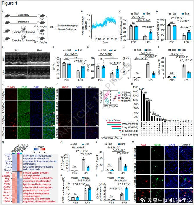 小鼠经3个月自愿转轮运动后,腹腔注射脂多糖(LPS)构建SICM模型,结果显示:运动组小鼠体温下降幅度减少30%、体重丢失减少25%,左室射血分数(EF)和缩短分数(FS)分别提升21%和34%;且心肌凋亡(TUNEL染色)和氧化损伤(DHE 染色)水平降低50%以上,血清促炎因子IL-1β、TNF-α浓度显著下调。