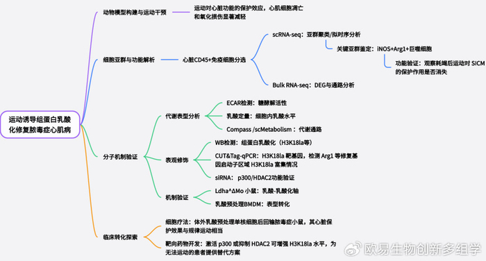 该研究围绕脓毒症心肌病(SICM)的免疫失衡核心问题,系统探究了运动介导的表观遗传调控机制,首先通过构建SICM动物模型与运动干预体系,结合单细胞转录组分离培养技术,明确运动对单核细胞源巨噬细胞功能的调控作用;其次,采用表观遗传组学技术聚焦组蛋白修饰,鉴定出运动可显著诱导单核细胞源巨噬细胞发生组蛋白乳酸化修饰,进一步通过分子生物学实验(如 ChIP-qPCR、Western blot等)验证该修饰的特异性与表达特征;随后,深入探究组蛋白乳酸化的功能机制,通过基因沉默、过表达等手段,证实该修饰可直接调控巨噬细胞极化相关基因的转录表达,进而抑制M1 型促炎表型活化、促进M2型抗炎修复表型极化,减少促炎细胞因子(TNF-α、IL-6)分泌并增加抗炎因子(IL-10)释放;最后,通过巨噬细胞移植实验与体内干预验证,明确运动诱导的巨噬细胞组蛋白乳酸化修饰可通过重塑心脏免疫微环境,减轻SICM模型中心肌炎症浸润、心肌细胞凋亡及纤维化,最终恢复心脏收缩与舒张功能,完整解析了 “运动-巨噬细胞组蛋白乳酸化-心脏免疫稳态-心功能改善” 的调控链条。