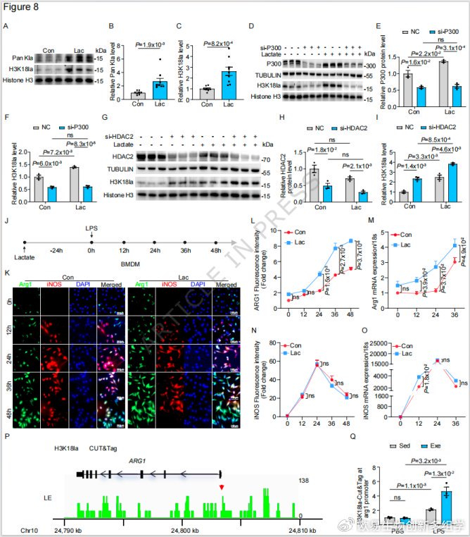 CUT&Tag-seq分析显示,H3K18la在Arg1基因启动子区富集,运动可进一步增强该富集水平;乳酸预处理的骨髓来源巨噬细胞(BMDM)在LPS刺激后,Arg1表达上调4倍,iNOS表达无显著变化,加速向修复表型转换。