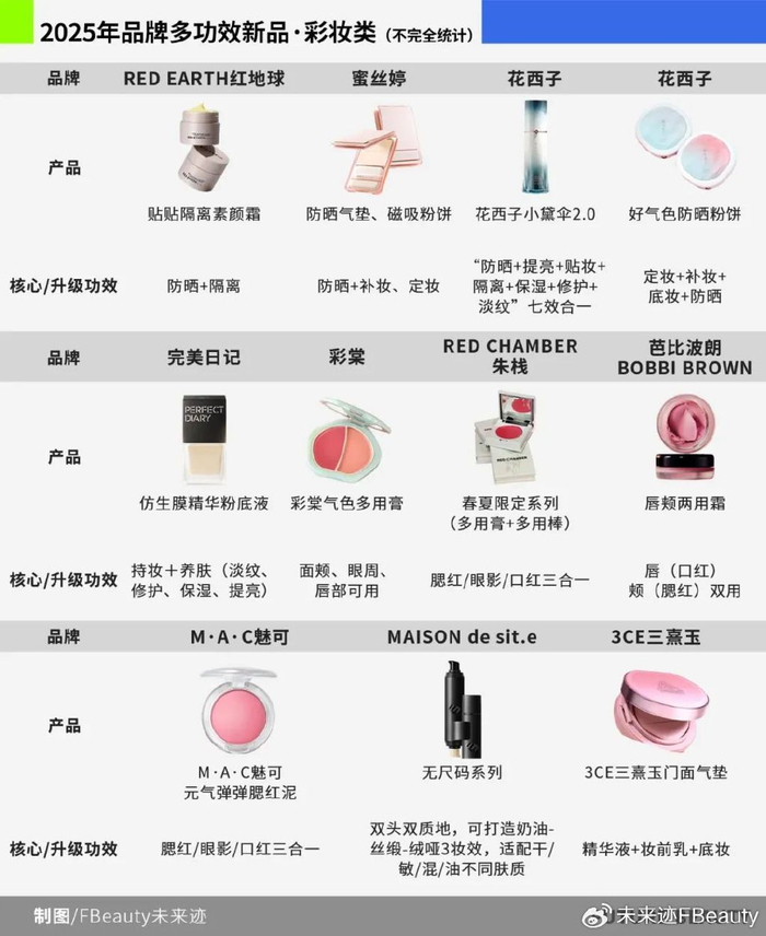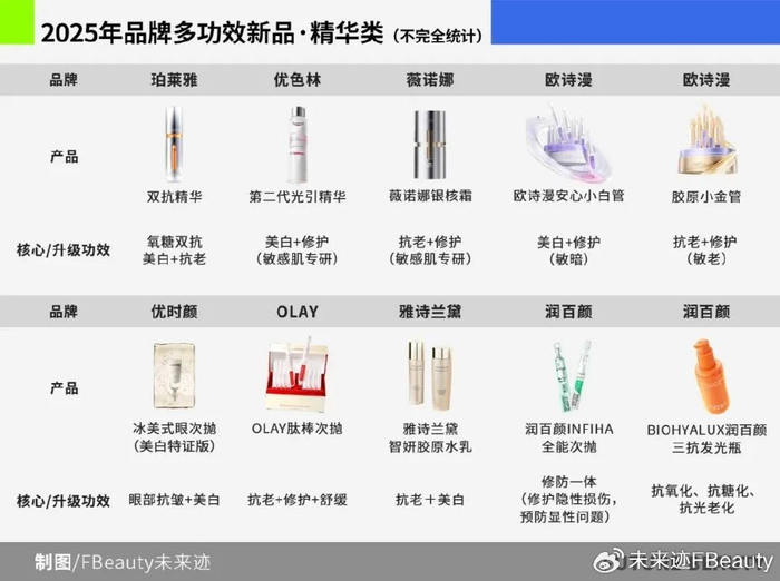 《FBeauty未来迹》发现,2025年以来,品牌们在升级经典单品或推出新品时,都不约而同地将“多功能合一”作为核心卖点。这一现象在护肤精华、防晒以及彩妆品类中尤其突出。