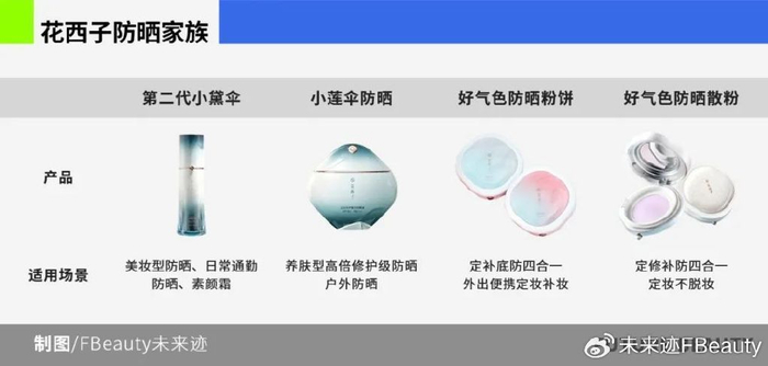 锚定“防晒+彩妆”跨界创新的花西子将多效做到了极致,搭建起从户外到日常通勤到定妆、补妆全场景覆盖的“防晒家族”。