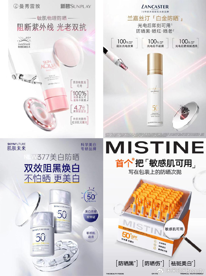 “防晒+美白”无疑是这一趋势中最耀眼的潮流,品牌们纷纷以“双证”作为实力背书。曼秀雷敦新碧小粉帽、兰嘉丝汀Lancaster白金防晒、SKYNFUTURE肌肤未来377美白防晒霜等产品均拿下“防晒+美白”双证;而「蜜丝婷MISTINE美白精华防晒次抛」则更进一步,在防晒与美白的双效基础上,强调其温和安全性,将目标人群扩展至敏感肌及医美术后人群。