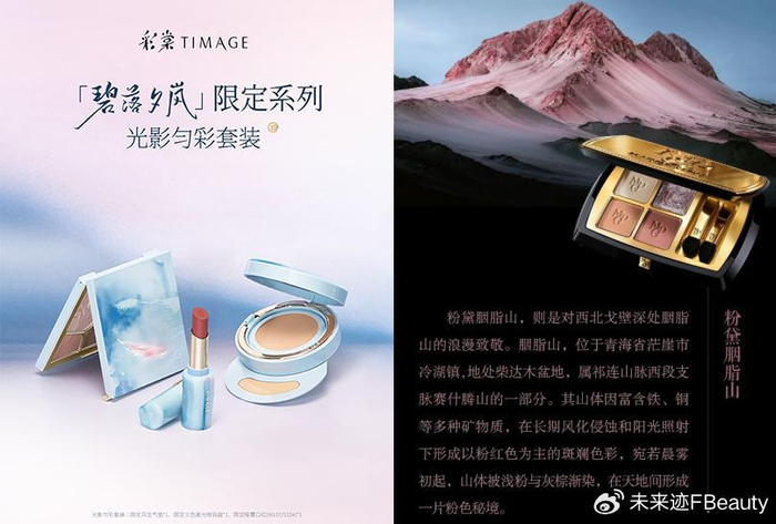 彩棠的“碧落夕岚”系列以传统色和节气为灵感,为消费者塑造山水间、朝霞暮色之时放松、闲适的中式画面。“限定双生气垫、三色高光修容盘等产品,都是蓝调里取来的一抹情绪,色彩温柔洇晕,将水天共色的空灵定格于妆容。”
